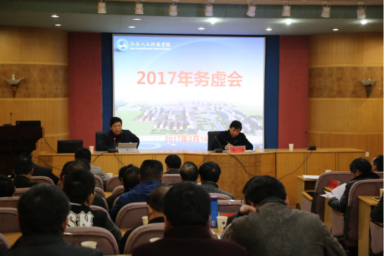 校长刘和云从党建思政、学科建设、硕士点建设、转型发展、创新创业、师资建设、审核评估、内部管理、基建维修、平安校园、文明创建等方面,对2017年学校工作作了深入思考。他要求全体干部教师在“学”字上下功夫,联系工作实际开展学习;在“谋”字上动脑子,善谋事,多谋事,多想事,深化管理,改革创新;在“干”字上出真招,营造想干事,敢干事,会干事,干成事的氛围;在“争”字上求主动,争取各种资源,争取各级政府各个部门的支持;在“稳”字上做文章,从细处着手,维护稳定,确保校园平安;在“实”字上求突破,真抓实干,各项工作都要落到实处。