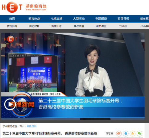 6.湖南教育电视台:《第二十三届中国大学生羽毛球锦标赛在开幕香港高校参赛数创新高》(链接:http://www.hnedutv.com/gonews?id=13013&from=groupmessage&isappinstalled=0 )