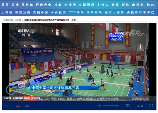 1.CCTV-5体育晨报:《第23届中国大学生羽毛球锦标赛开赛》(链接:http://tv.cntv.cn/video/VSET100150750774/c06fd13dfcde41ecb36478bde5c019aa )