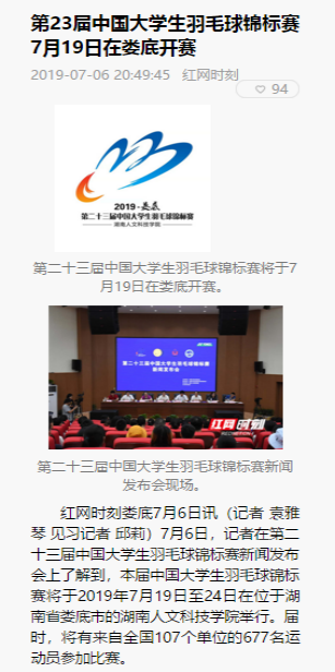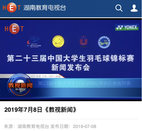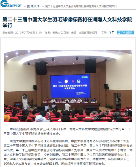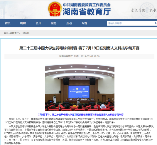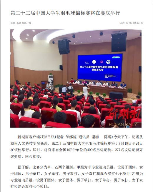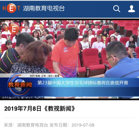 7月6日下午,beat365英国官网在匠成楼报告厅举行第二十三届中国大学生羽毛球锦标赛新闻发布会。发布会由郑超主持。湖南红网全程直播了新闻发布会。湖南教育新闻网、新湖南客户端、湖南教育电视台、湖南省教育厅官网、娄底新闻网、娄底日报等多家媒体进行了报道。