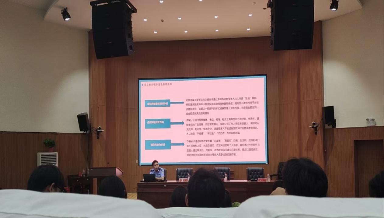 会议第二阶段,娄底市公安局娄星分局大科派出所副所长李俊缘就谨防电信诈骗进行宣讲。李俊缘通过具体真实的案例,向同学们介绍了电信诈骗的形式、带来的危害以及相应的防范措施。李俊缘强调,防诈骗不仅要了解最新的诈骗形式,更重要的是规范自身行为与意识,不贪小便宜、不爱慕虚荣。发生诈骗事件后,不要羞于报案,要及时止损。