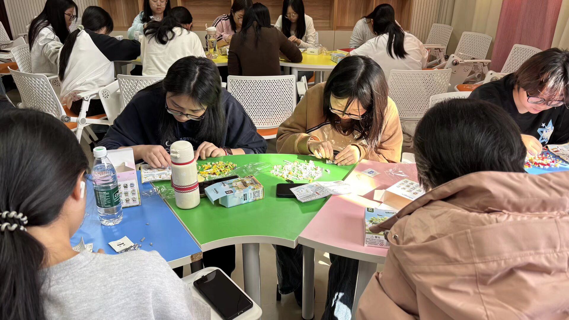 活动开始,工作人员向在场学生详细介绍了心理中心相关信息,帮助同学们深入了解学校的心理健康资源。随后进入趣味手工创作环节:“积木筑心”让同学们在自由创作中释放压力,用双手抚平心绪;“漆扇诉心”将流动的颜料与扇面结合,引导大家接纳不确定性,拥抱内心多样可能;“心域流沙”借助非语言的沙画创作,搭建起与自我情感对话的桥梁;“串个‘饰’界”,同学们精心挑选将各色珠子串联,设计出承载心情与寓意的独特作品。活动现场氛围轻松热烈,同学们从繁忙的学业中抽出时间在手工制作中找到一方滋润心灵的净土。