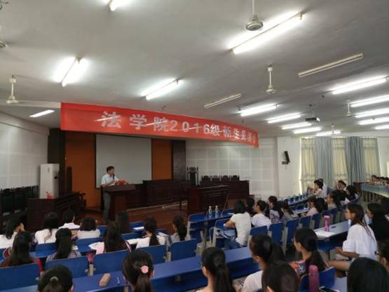 大会首先是新老生代表发言,16级法一班的曾小静作为新生代表,她表达了勇于追求梦想和目标的决心,表示将不畏挫折,乐观面对。15级法二班的李静作为老生代表,表达了自己对新生的欢迎和祝愿,同时分享了自己作为老生在大学生活、学习、工作等方面的经验。接着王老师从调整心态、做好学习规划、找到正确的学习方法,开阔视野,拓展思维,辩证批判式学习风格,理论联系实际等方面给学生做了指导。谢书记从健康自信、遵纪守法,尊敬师长,团结友爱,全面发展等五个方面对大学生活做了一个诠释。最后,朱院长对法学院的教学、师资、硬件设施配备以及我院的特色等方面做了简要的介绍,并在最后表达了对全体新生的殷切的期望和美好的祝愿。