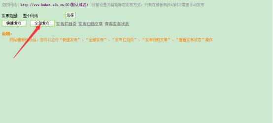 一般情况下,文章修改重新发布后,网页会自动更新,请多刷新下网页。如果网页还是不更新,点击“发布网站”,对整个网站进行“全部发布”,由于此操作可能耗时较久,可以积累一定数量的重新发布的网页之后,统一进行整个网站的“全部发布”操作。很久以前文章删除后网页还显示的问题参考前面的方式解决,解决方式相同,对整个网站进行“全部发布”即可。
