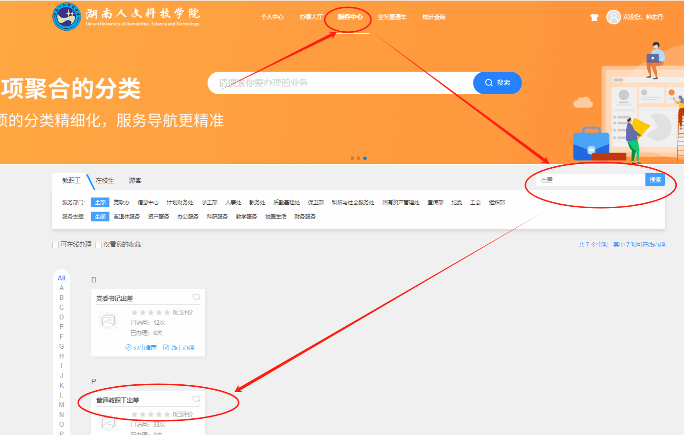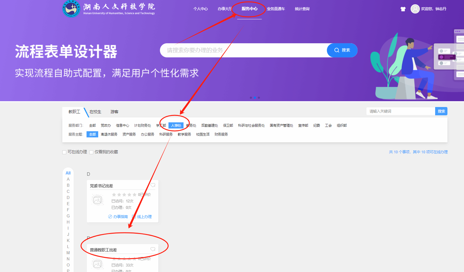 四、以出差为例,方法二:进入“服务中心”,出差是人事处主管,那就点“人事处”,可以搜出人事处所有流程,选择相应的出差流程。