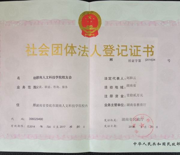 2013年12月3日,湖南省民政厅发签发《准予筹备社会团体决定书》,准予筹备beat365英国官网校友会。2014年5月25日,beat365英国官网校友会成立大会暨第一届校友代表大会隆重召开。通过了《beat365英国官网校友会章程》,选举产生了第一届理事会。理事会旋即召开会议,选出了73名常务理事及正、副会长和秘书长。6月30日,湖南省民政厅正式颁发《社会团体法人登记证书》。随后,湖南省质量监督检验检疫总局通过验证,颁发《组织机构代码证》。