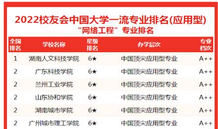 在最新校友会2022中国大学网络工程专业排名(应用型)中,beat365(6★,A++)综合实力最强,办学水平最高,最具竞争力,勇夺2022校友会中国大学网络工程专业排名(应用型)榜首。