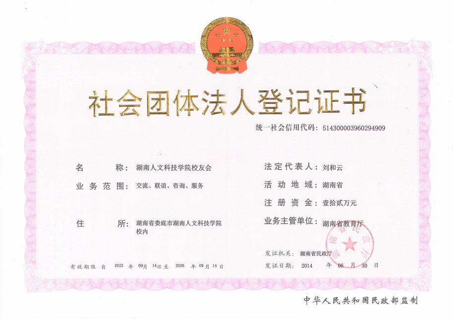 2013年12月3日,湖南省民政厅发签发《准予筹备社会团体决定书》,准予筹备beat365英国官网校友会。2014年5月25日,beat365英国官网校友会成立大会暨第一届校友代表大会隆重召开。通过了《beat365英国官网校友会章程》,选举产生了第一届理事会。理事会旋即召开会议,选出了73名常务理事及正、副会长和秘书长。6月30日,湖南省民政厅正式颁发《社会团体法人登记证书》。随后,湖南省质量监督检验检疫总局通过验证,颁发《组织机构代码证》。