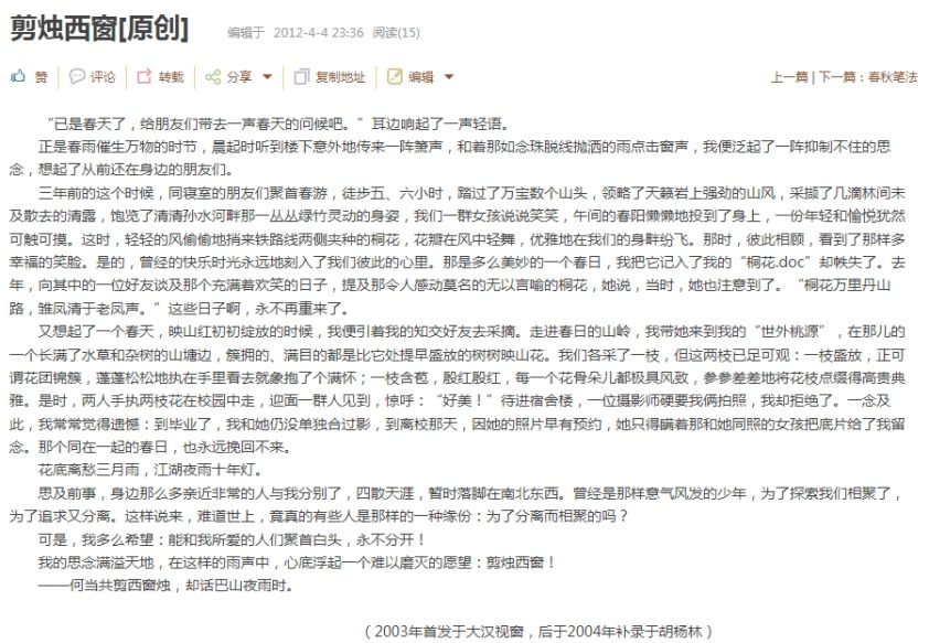在这座殿堂里,处处是我心安处。毓师园里,有我最初体认到“以教为学”魔力的经历(其实就是骑在那个石雕的梅花鹿上面,对同窗好友输出我当天的感悟和所学,然后就觉得更加厘清了我的思路),也有着我最爱的五角星花(被我写进了我的生活随笔《夏日·午后》:有时往往,一桩细小的往事,就这样在明晃晃的阳光下,在夏日的这样一个午后,猝不及防地闪回,美好如昨。||风轻飏,鸟声碎,樟香细,走在阳光下,一如走在香氛的心情中,淡淡真纯的前调,渐渐酽醇的中调。含笑花本是深浓的香调,近了倒反不闻,身后扬起了风,却回旋出了它的香。||“绿窗春睡轻,几处簸钱声”,又象走在了古往今来里的各种午后的心情中。||又想起殷红缠绵的五角星花,那被我特定为了大学时代毓师园的夏日印象。)。有摄影课上,在校园各处取景或由同学们摆pose入镜,生疏但热情高涨地调着景深和焦距学拍照的新奇靓丽;有图书馆里,“读书社”社团活动上,对我读到的林徽因和梁思成侃侃而谈的潇洒自如;有计算机房里,用最古老的打小蜜蜂练字、熟记字根盲打五笔的勤苦,有用WORD文档记录心情(《桐花.doc》)时的专注,有实践自己对电脑应用的一个个设想的玩味;有立男女生宿舍楼楚河汉界处,注意到男生楼门口竹子长得不如女生楼的,问同系男同学说“这个情况用成语咋表达”的调侃(也是高中时的竞争对手,算是兄弟一样的交情,后来好像还说到了“虽千万人吾往矣”,只记不清了中间当年是怎样的启承转合);有穿图书馆前坪到女生宿舍楼,被爱好摄影的街拍者追逐但婉拒的遗憾(这个记录在了我的《剪烛西窗》,可惜当年要是真拍下来了我和好友的那一份风华正茂+光彩照人就好了);有宿舍里向舍友许愿说生日礼物要麻辣、邻室寄宿生互相分享周末从家里带来的爱心便当、为了开一个难开的罐头在本班女生宿舍挨家挨户求援、用“N袋苹果”作为金钱衡量单位的吃货本色。英语视听说课上,语音室的环绕立体声把圣经故事传播得如临其境;英语系的系办更是收藏了不少打动人心的好书,我时常去借阅,如英译版的《三国演义》,还有让我知道了“lift”一词有“升华(本领)”意味的那本《天涯知音》(这个词语出现在书里其中的一个小故事the listener天涯知音中,这本书被我强烈推荐给了同窗好友)。