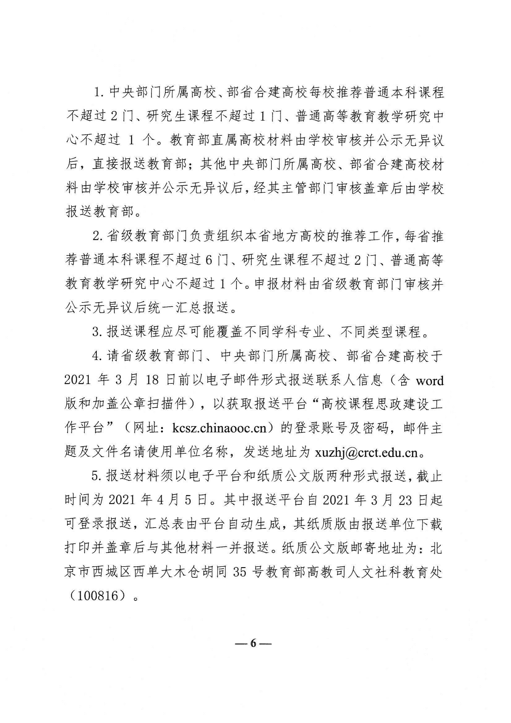 (3)各省属高校推荐普通高等教育教学研究中心不超过 1 个。学校的申报材料经我厅组织专家评审并公示无异议后,由厅有关处室通知入选院校在“高校课程思政建设工作平台”正式填报,按流程报送教育部。