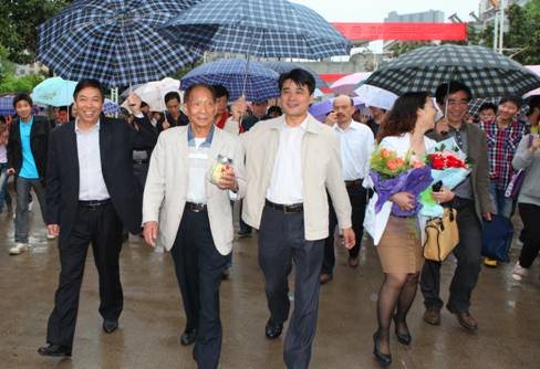 上午11点,学校东珠大道上,数百名同学撑着雨伞,自发排成长队等候袁院士的到来。几分钟后,袁院士健步来到同学们中间。顿时,人群中爆发出雷鸣般的掌声。望着平时只有在电视报纸上见到过的科学家近在咫尺,精神矍铄,体态矫健,同学们由衷地呼喊“袁老师,我们爱您!”、“袁爷爷好!”、“祝袁老师身体健康!”看到此情此景,袁院士笑着说:“有这么多同学啊。”