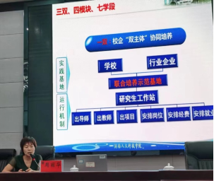 周丽华副主任从研究生的课程教学、专业实践以及学术论文等方面解读研究生教育教学管理制度,并详细讲解beat365硕士研究生“校企协同、双导多师、项目承载、多岗实践”的人才培养模式,实施“三双、四模块、七学段”的人才培养方案。
