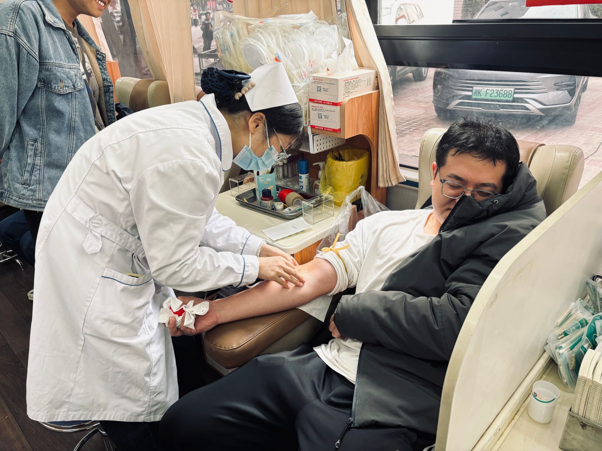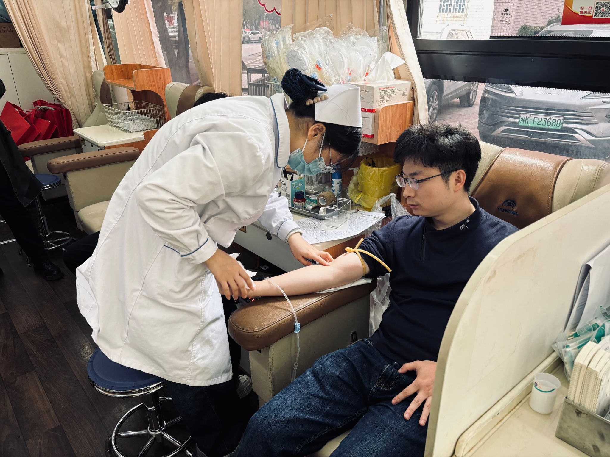 献血前,同学们进行了详细的填表及检测,以确定身体符合献血条件。随后,医护人员细心为同学们测量血压,并耐心讲解献血相关知识和注意事项。同学们勇敢地伸出了自己的臂膀,捐献自己宝贵血液。献血过程中,研究生部老师及同学始终陪伴在旁,密切关注着献血者的身体状况,确保整个献血过程的安全与顺利。