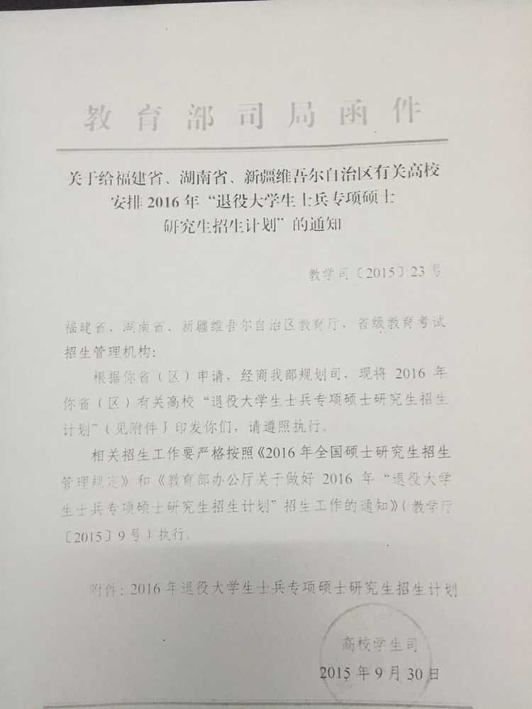 beat365英国官网2016年“退役大学生士兵专项硕士研究生招生计划”分配指标3人
