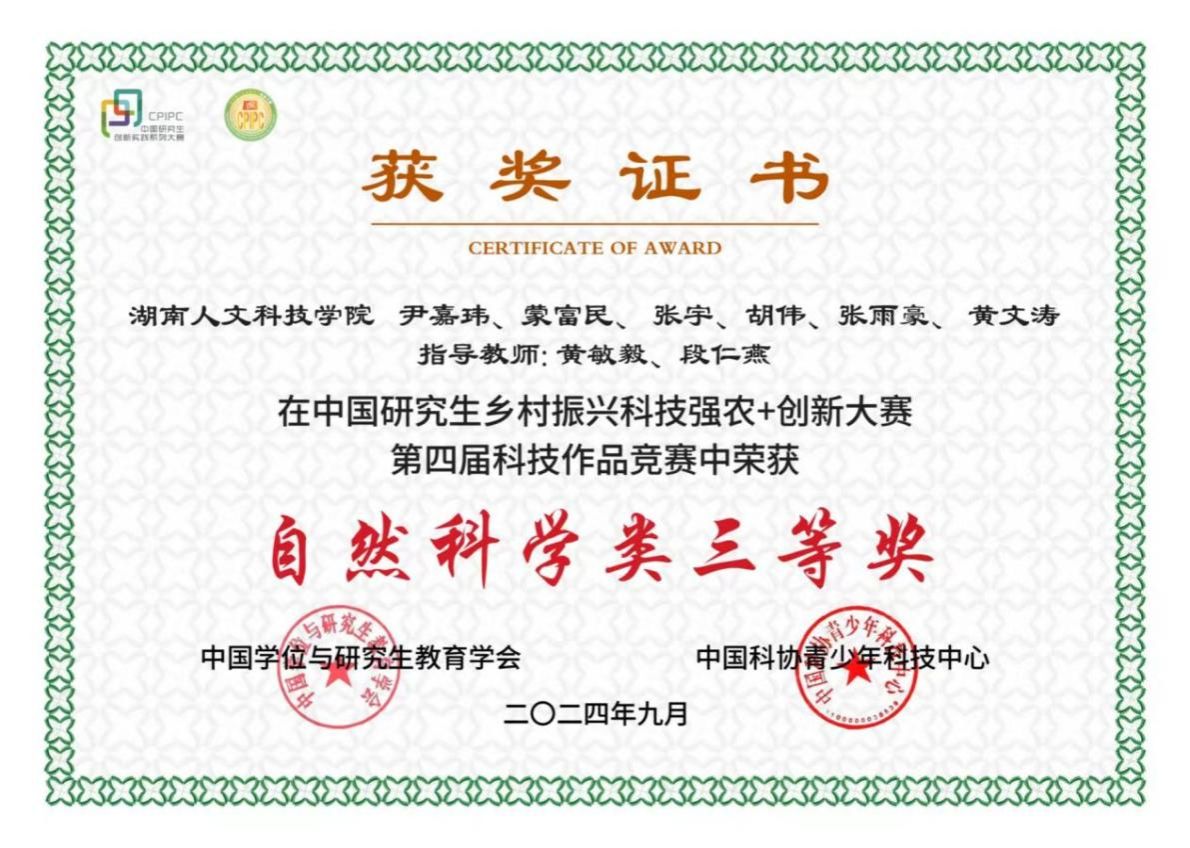 经过全国紧张激烈的角逐,九月,beat365黄敏毅、段仁燕教授指导的研究生团队(尹嘉玮,蒙富民,张宇,胡伟,黄文涛,张雨豪)喜获“中国研究生乡村振兴科技强农+创新大赛“第四届科技作品竞赛全国三等奖。