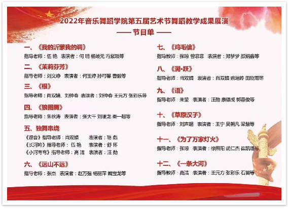 此次展演的舞蹈作品由舞蹈教研室全体教师参与,指导,师生共同演绎,兼顾了艺术性和思想性,精彩绝伦,令人赞叹不已,充分展现了音乐舞蹈学院学子朝气蓬勃的精神面貌和扎实的舞蹈功底。