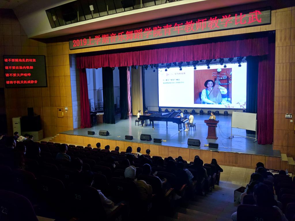 201949下午两点半,为配合学校本年度青年教师教学比武活动以及顺利通过学校审核评估,加强课堂教学管理,提高教师课堂教学水平与能力,音乐舞蹈学院在逸夫楼音乐厅举办了青年教师课堂教学比武。为组织好本次活动,音舞学院邀请学校文科督导组全体督导专家和在院内随机抽选部分职称高、教学能力强和教学经验丰富的教师担任评委,音乐舞蹈学院班子领导和全体专任教师一起现场聆听和观摩的整个教学比武全过程,音舞学院副院长李旭开担任大赛主持。