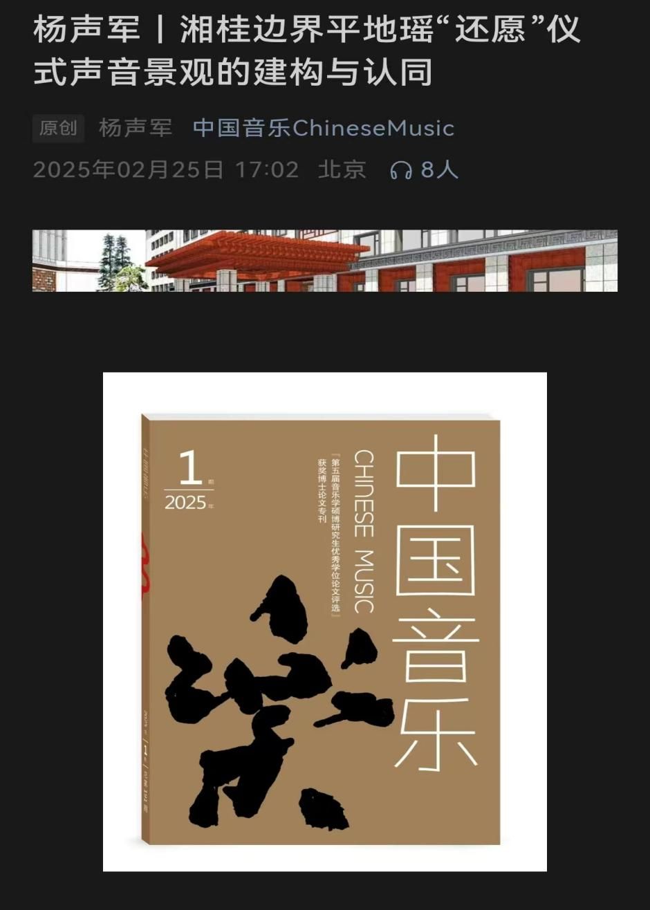 近日,beat365音乐舞蹈学院杨声军博士撰写的论文《湘桂边界平地瑶“还愿”仪式声音景观的建构与认同》发表于《中国音乐》(2025年第一期)。《中国音乐》为中国音乐学院主办的期刊,为“中文社会科学引文索引(CSSCI)”,北京大学《中文核心期刊总览》,《中国人文社会科学期刊AMI综合评价报告》艺术类核心期刊,属于音乐类顶级期刊。