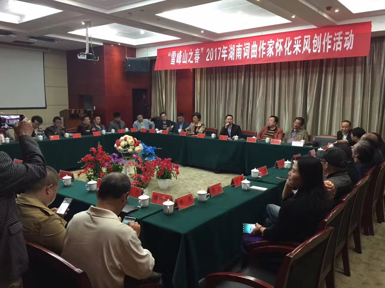 为迎接党的十九大胜利召开,认真贯彻落实习近平总书记在文艺工作座谈会和全国第十次文代会上的讲话精神,深入生活,扎根人民,着力“出精品力作、出优秀人才”,繁荣湖南音乐创作,由湖南省音乐家协会、怀化市文体广新局、怀化市文联、怀化市音协等单位联合主办的“雪峰山之春”2017年湖南词曲作家怀化釆风创作活动,于2017年4月24日至28日在怀化洪江市举行。我院音乐舞蹈学院院长、娄底市音乐舞蹈家协会主席、国家一级作曲谢坚强教授应邀与我国著名词作家张名河先生一同参加了笔会,并作了精彩的词曲创作讲座。本次会议共有来自永州、邵阳、娄底、怀化、湘西等市州40余人词曲作家参加了釆风创作活动。这次釆风创作活动对于加强我院校企合作、扩大学校影响、繁荣我市音乐创作起到了积极的推动作用。