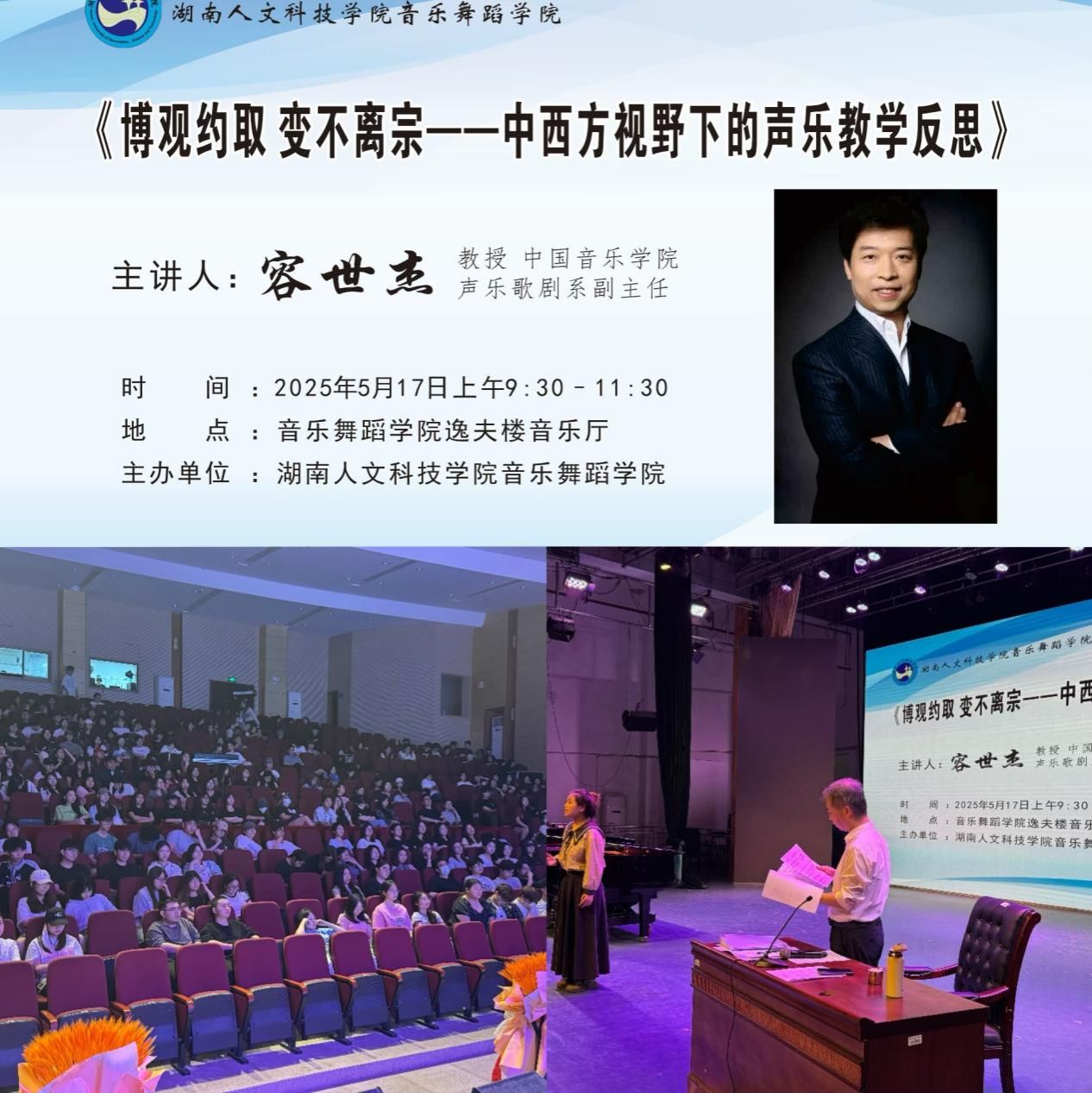 5月17日上午,中国音乐学院声乐歌剧系副主任容世杰教授,在beat365英国官网音乐厅带来《博观约取 变不离宗——中西方视野下的声乐教学反思》专题讲座,音乐舞蹈学院副院长吴扎拉·涛主持,师生代表踊跃参与。