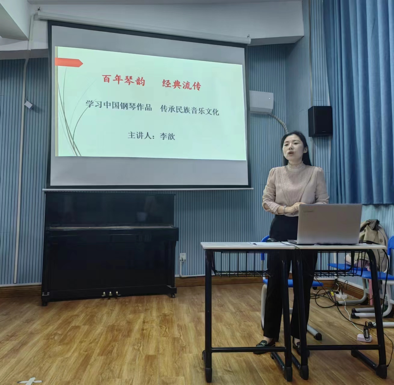 中国钢琴作品的创作已走过近百年的历程,为更好的开展中国钢琴作品演奏与教学,提高我院学生学术水平与专业素养,我院李歆博士于2023年10月23日晚7:30在逸夫楼605声乐实训室开展了一次关于学习中国钢琴作品,传承民族音乐文化的学术讲座。讲座由钢琴教研室田苗老师主持,来自音乐舞蹈学院钢琴教研室的老师们和全院钢琴专业的学生参加了讲座。