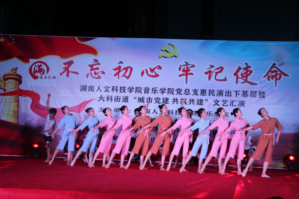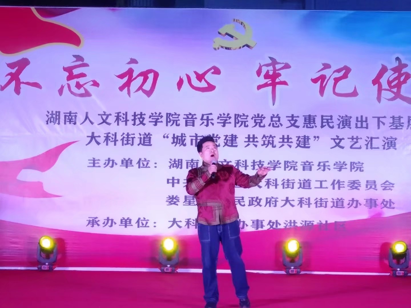 10月29日晚七点半,由中共beat365英国官网音乐舞蹈学院党总支部举办的“不忘初心、牢记使命”文艺汇演在娄底市娄星区大科街道办事处洪源社区举行。beat365英国官网组织部常务副部长罗求实、机关党委书记刘纲华、宣传统战部部长陈璐、音乐舞蹈学院党总支书记周邦春、副书记邓莉立、副院长吴扎拉·涛、副院长刘利连及洪源社区领导代表出席本次活动。音乐舞蹈学院全体师生党员及部分学生群众共同为洪源社区的父老乡亲们奉上了一台精彩的红色演出。