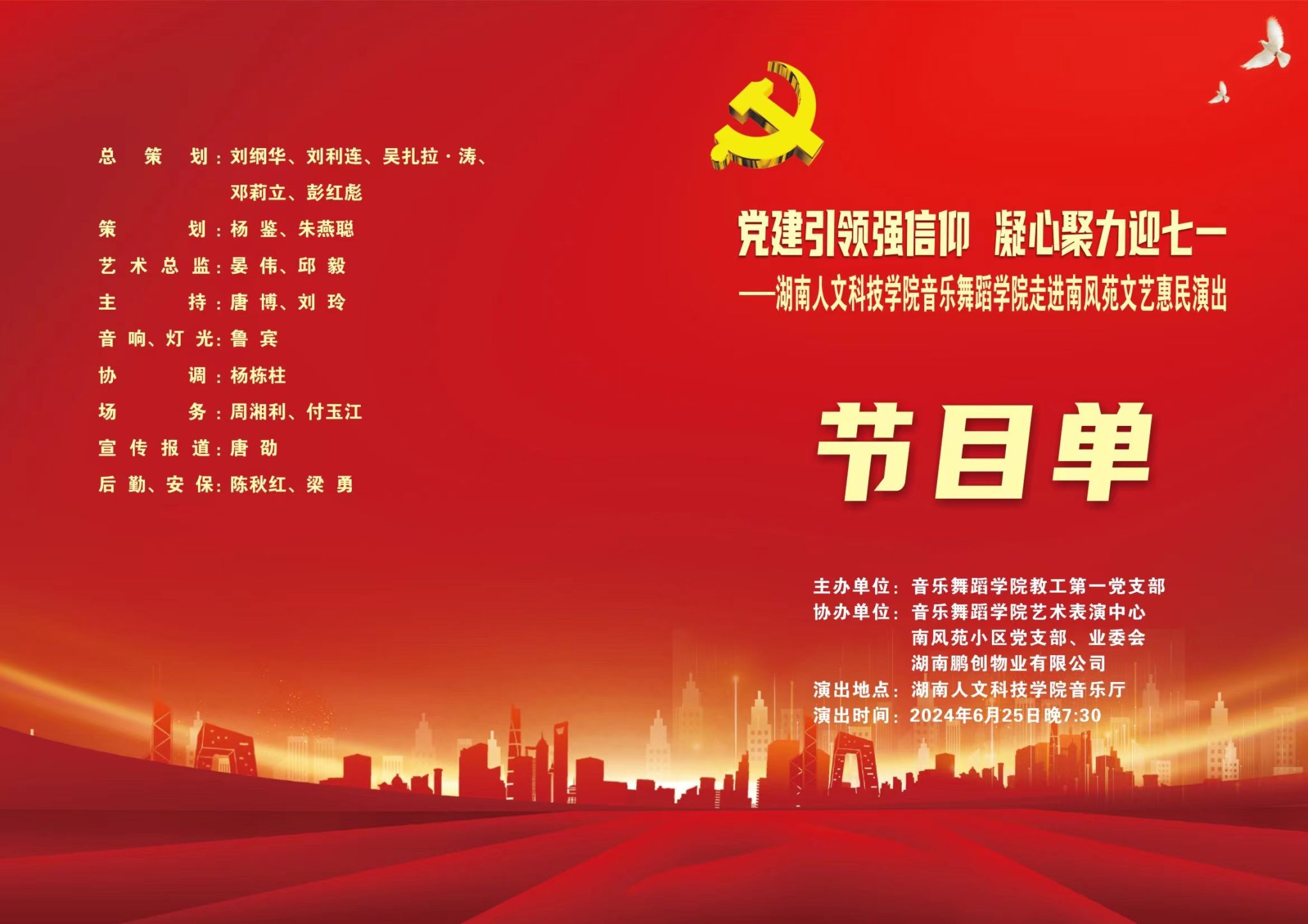 在中国共产党103岁华诞即将到来之际,beat365英国官网音乐舞蹈学院教工第一党支部于2024年6月25日晚7:30在学校音乐厅开展“党建引领强信仰 凝心聚力迎七一”走进南风苑文艺惠民演出。音乐舞蹈学院师生党员以及南风苑业委会代表和500名观众参加了本次活动。