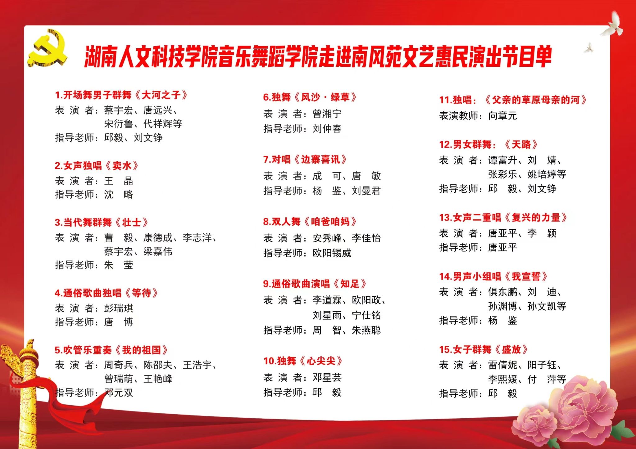 晚会由教师党员唐博、刘玲主持,15个节目集艺术性和观赏性为一体,演员们用红色经典歌舞展现了中国共产党带领中国人民从站起来到富起来到强起来的光辉历史。