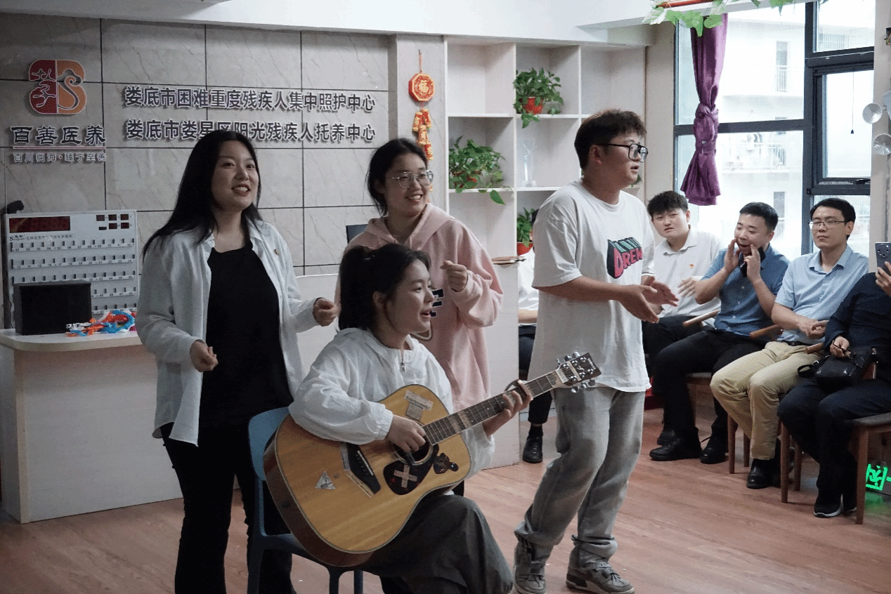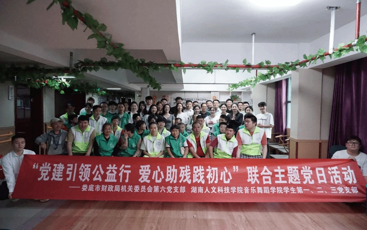 2024年5月31日下午,beat365英国官网音乐舞蹈学院学生第一、二、三党支部在第三党支部书记朱璐老师的带领下来到娄底市娄星区阳光残疾人托养中心,与娄底市财政局机关委员会第六党支部共同看望正在接受康复治疗的残障人,开展“党建引领公益行,爱心助残践初心”主题党日活动,为他们送去关心和慰问。
