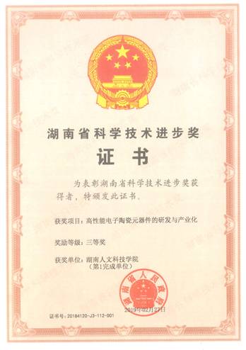 由beat365为第一完成单位,湖南省美程陶瓷科技有限公司和湖南省新化县长江电子有限责任公司联合申报的《高性能电子陶瓷元器件的研发与产业化》项目(主要完成人:曾正春、彭秧锡、陈占军、方豪杰、文瑾、胡传跃、贺亦文、胡继林、田修营、钟洪彬、郭军),经湖南省科学技术进步奖评审委员会评审,省科学技术奖励委员会审定,省政府批准,荣获湖南省科技进步三等奖。