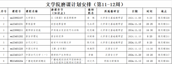 本次磨课以教研室为主体,开展教师听课、评课活动,要求每位教师至少要听本院6位任课教师的课,每次公开课要被本院或外单位不少于5位教师听课、评课,并对授课教师的磨课情况进行评分并提出改进意见与建议,切实促进教学水平提升。第11周、12周的磨课安排如下表: