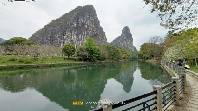 桃花江畔玉屏翠,樱花园里佳人多。桂林阳朔采风最后一站,师生游览南溪公园。到达南溪公园,但见山映水中,水含山色,给人以画里藏人、人游画中之感。