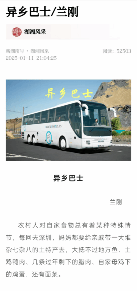 2025年,文学院着力创新党建特色品牌“文学+”,以党建带校友工作,“文学+校友导师计划”结出硕果。近日,文学院23级汉语言文学专业三班兰刚同学成功于省级媒体《新湖南》发表文学作品《异乡巴士》,这篇文章记录着那段通往深圳途中人与人之间的脉脉温情。