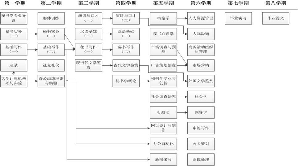 秘书学、秘书心理学、秘书实务、档案学、社交礼仪、办公自动化系统的管理与使用、基础写作、秘书写作、人际沟通、演讲与口才、古代文学鉴赏、现当代文学鉴赏、外国文学鉴赏、汉语基础、形体训练、速录。