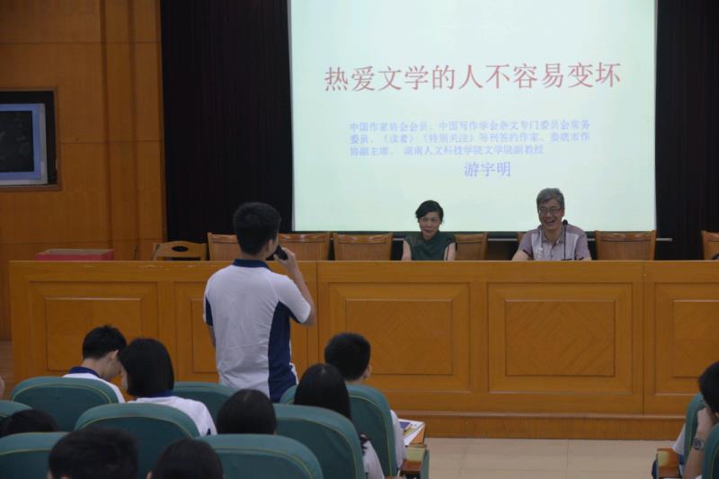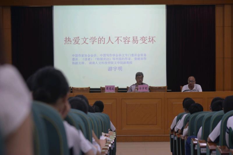 2019年6月19日,广东省尹军成名师工作室和周鸿波名师工作室研修活动下午场在佛山二中举行,我院教师、著名作家游宇明先生应邀为工作室的成员和高一年级四个班的学生作学术报告——《热爱文学的人不容易变坏》。