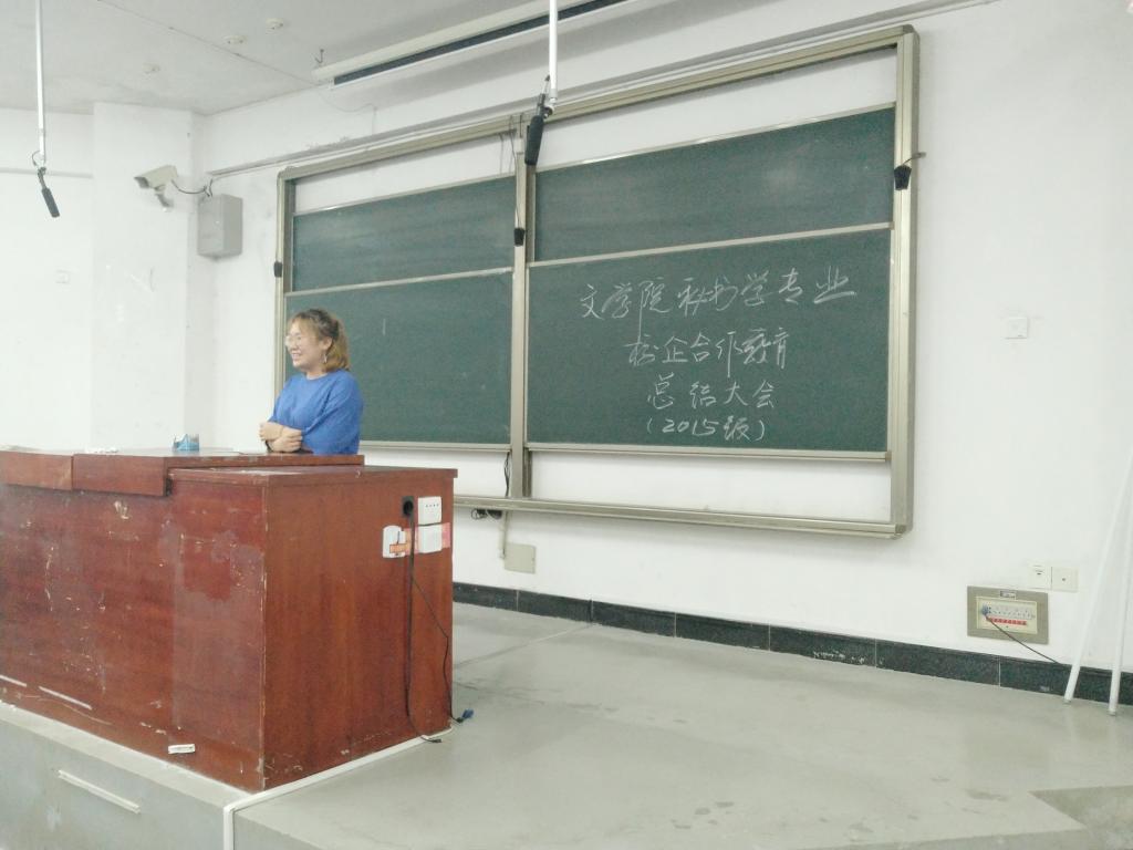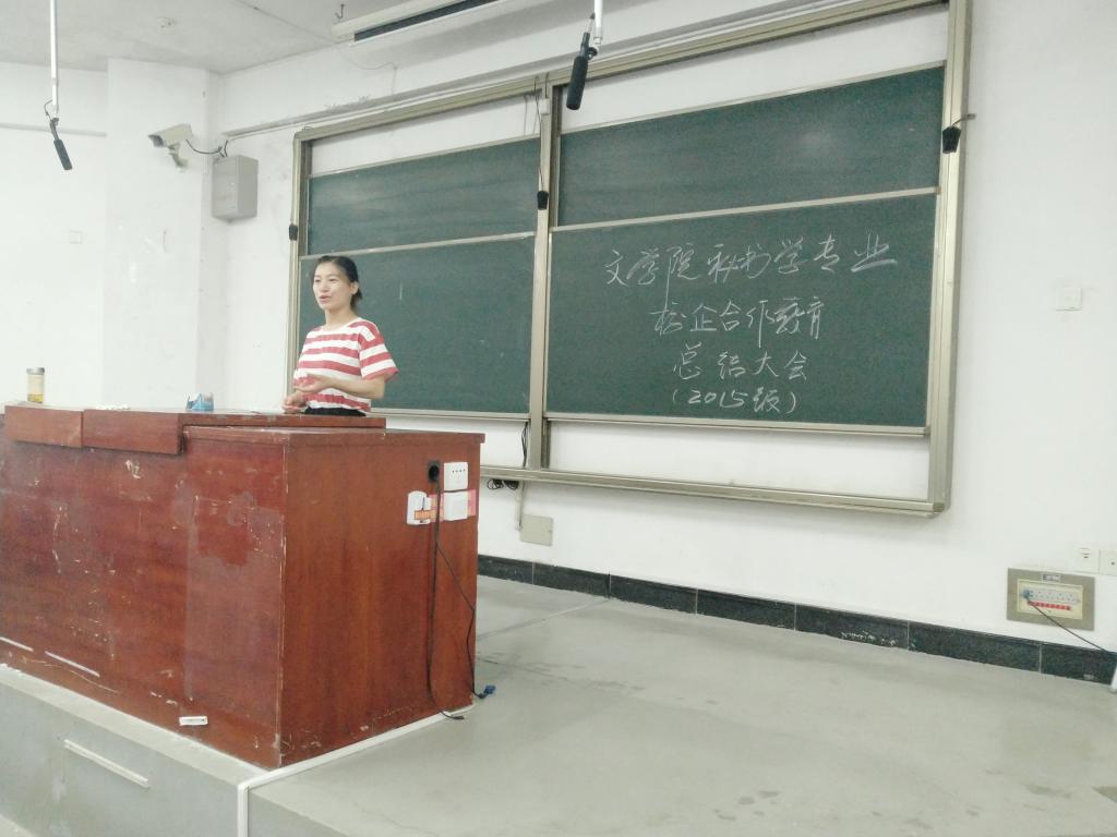 2018年6月19日晚7点半,15级秘书学专业校企合作教育总结大会在致远楼219教室召开,本次会议由秘书学教研室主任张峰主持,两班班委协助组织与管理。在各与会人员的积极参与下,大会取得圆满成功。