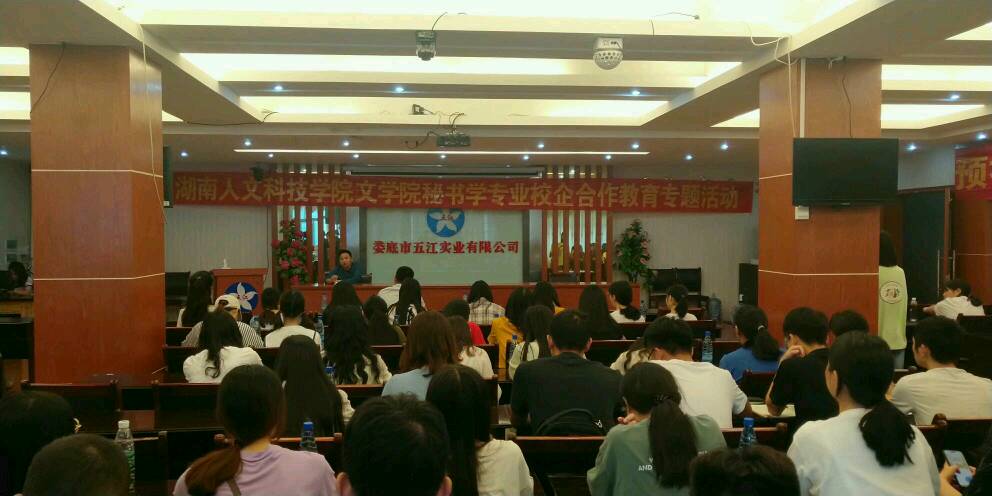 涟源市五江集团周总监为秘书学师生展示了五江集团的企业文化。他结合五江集团的创业史,宣讲了企业的使命、核心价值观和为人处事准则以及五江集团“志为行业一流,共创世界品牌”的美好愿景,并通过和、信、恩、严、勤、实、细、搏、新等理念的讲解,表达了对当今大学生未来融入企业的要求与希望。