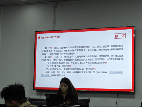 为深入学习习近平总书记关于党纪学习教育的重要讲话并落实相关指示,增强学生党员的党性观念,2024年4月25日,文学院学生第一、二支部开展“落实党纪学习教育,强化党员纪律意识”的政治学习。