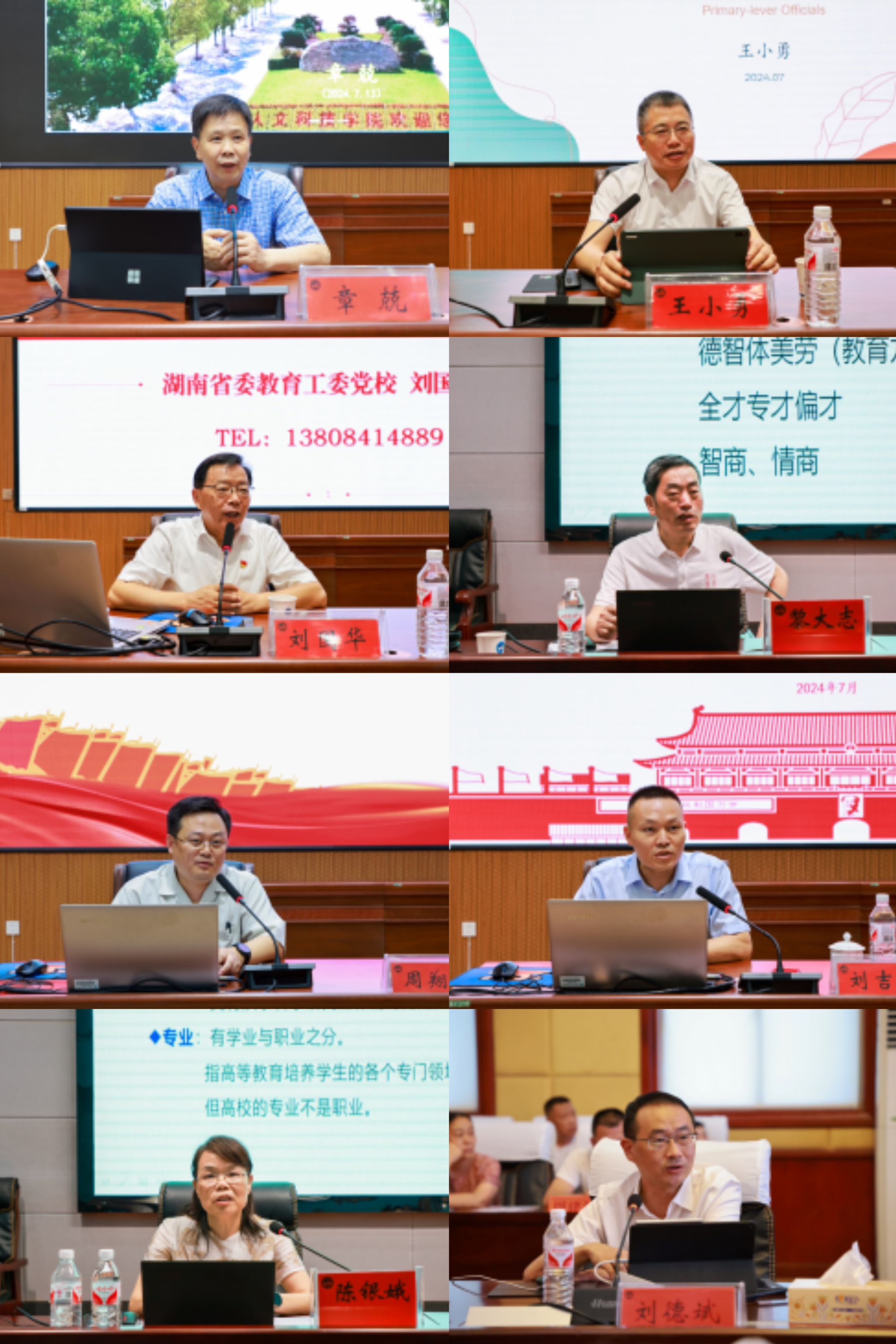 在分班培训阶段,党务干部、教学管理干部、管理干部三个重点班次,按干部不同类别开展有针对性的分班培训。在党务干部培训班,副校长刘铁峰以“沿用好办法、改进老办法、探索新办法,做学生思政教育工作的行家里手”为题,副书记朱强以“大思政格局中的‘书记’”为题,省委组织部组织一处四级调研员周翔宇以“发展党员和党员管理工作实务”为题,省电化教育馆馆长刘吉延“深入推进新时代高校党建‘双创’建设高质量发展”为题,指导党务干部队伍做好思政教育、党员发展与管理及高校党建“双创”等工作。在教学管理干部培训班,党委副书记朱强作《怎样做好二级学院院长》、副校长刘建勋作《以“问题导向、系统观念”为指导,高质量做好本科教育教学工作》、湖南信息学院校长黎大志作《本科教育教学管理漫谈》、长沙理工大学发展规划处处长陈银娥作《以学科建设为抓手,有组织科研,推动学校高质量发展》,分别就二级学院管理、教学科研、学科建设等方面进行了精彩授课。在管理干部培训班,副校长陈勇作《浅谈高校管理干部队伍建设》、娄底市政府办文电科科长刘德斌作《公文写作与办公实务》报告,分别结合就管理干部队伍建设、履职能力提升等主题进行指导。