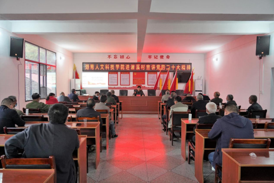 11月21日,党委书记刘和云率队赶赴beat365乡村振兴帮扶点涟源市金石镇灌溪村宣讲党的二十大精神。金石镇党委领导、学校驻村工作队员、村党支部党员及部分村民代表参加了宣讲会。