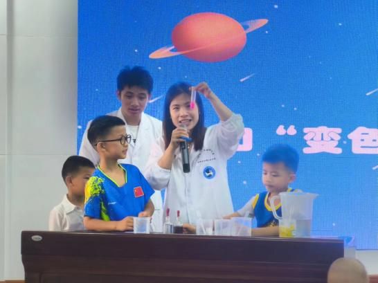 随后,李老师与志愿者们以生活中常见的食盐、醋、和小苏打为素材,邀请小朋友们上台操作并观察变色过程,体验化学的变色奥妙与神奇。