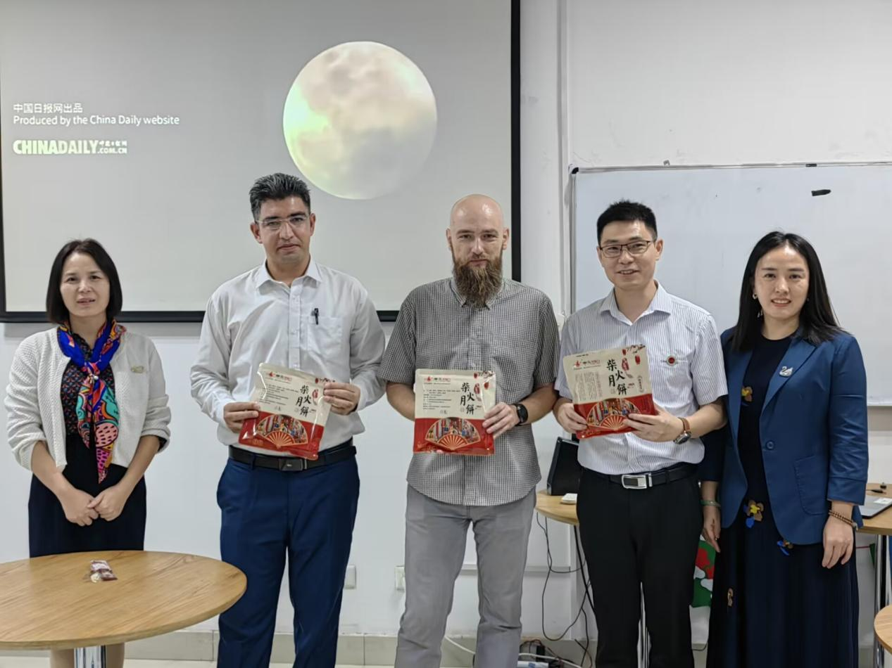 在正式交流之前,刘莉、文瑾、谭峰亮与外国友人一同分享象征团圆的月饼,并向所有为学院发展努力工作学习的师生员工送上真挚的祝福。