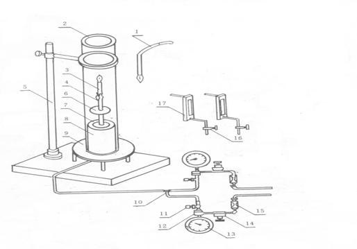1—点火器;2—玻璃燃烧筒;3—燃烧着的试样;4—试样夹;5—燃烧筒支架;6—金属网;7—测温装置;8—装有玻璃珠的支座;9—基座架;10—气体预混合结点;11—截止阀;12—接头;13—压力表;14—精密压力控制器;15—过滤器;16—针阀;17—气体流量计。