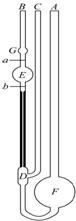 3.溶剂流出时间t0的测定:向粘度计中加入纯水20ml,恒温2分钟,进行测定。测定方法如下:使C管不通气,在B管处用洗耳球将溶剂从F球经D球、毛细管、E球抽至G球2/3处,让C管通大气,此时D球内的溶液即回入F球,使毛细管以上的液体悬空。毛细管以上的液体下落,当液面流经a刻度时,立即按停表开始记时间,当液面降至b刻度时,再按停表,测得刻度a、b之间的液体流经毛细管所需时间。重复这一操作至少三次,相差不大于0.3s,取三次的平均值为t0。