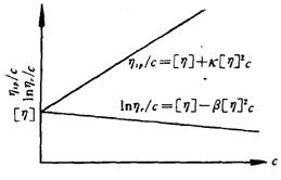 式中,κ和β分别称为Huggins和Kramer常数。这是两个直线方程,因此我们获得[η]的方法如左图所示。一种方法是以ηSP/c对c作图,外推到c→0的截距值;另一种是以lnηr/c对c作图,也外推到c→0的截距值,两条线应会合于一点, 图27-1外推法求特性粘度[η]