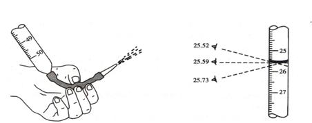 (三)读数:常用滴定管的容量为50mL,每一大格为1mL,每一小格为0.1mL,读数可读到小数点后两位。读数时,滴定管应保持垂直。视线应与管内液体凹面的最低处保持水平,偏低偏高都会带来误差。(见图2-4)
