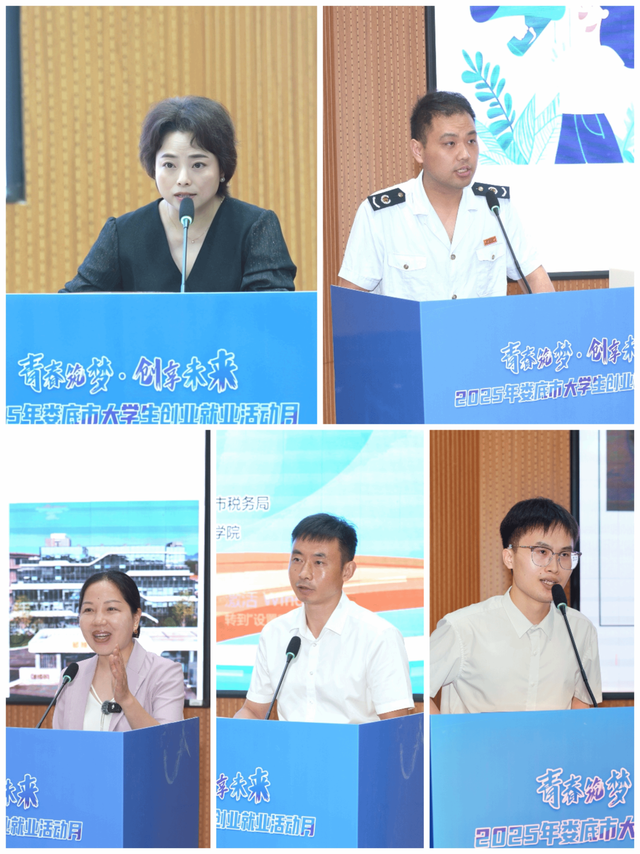 第二阶段为政策宣讲,校党委委员、副校长谭峰亮主持。市人社局、市税务局分别解读就业创业补贴、税收优惠等政策;巾帼创业典型邬辣妈集团等创业代表分享创业经验;娄底经开区园区宣讲创新创业孵化基地措施。