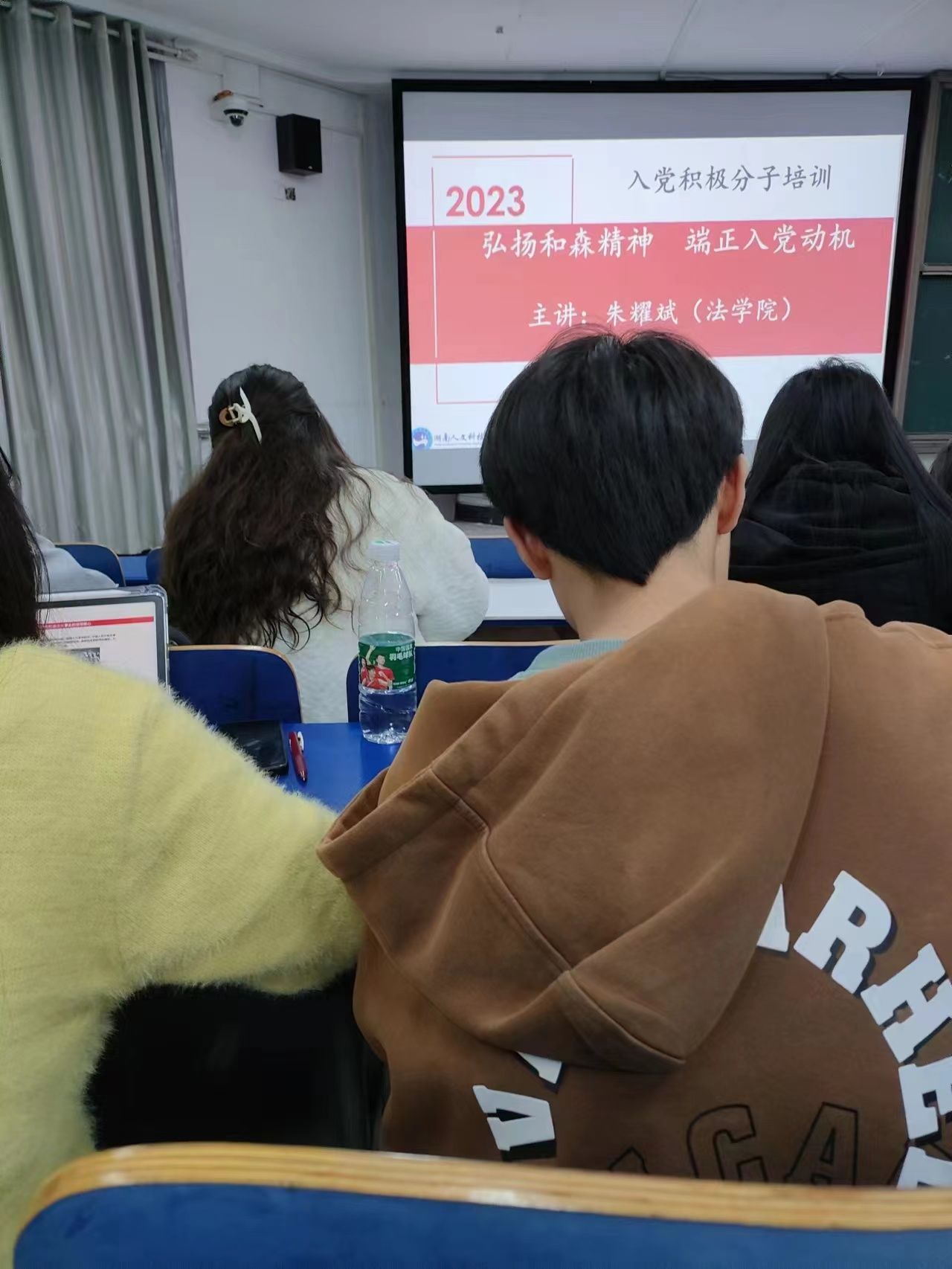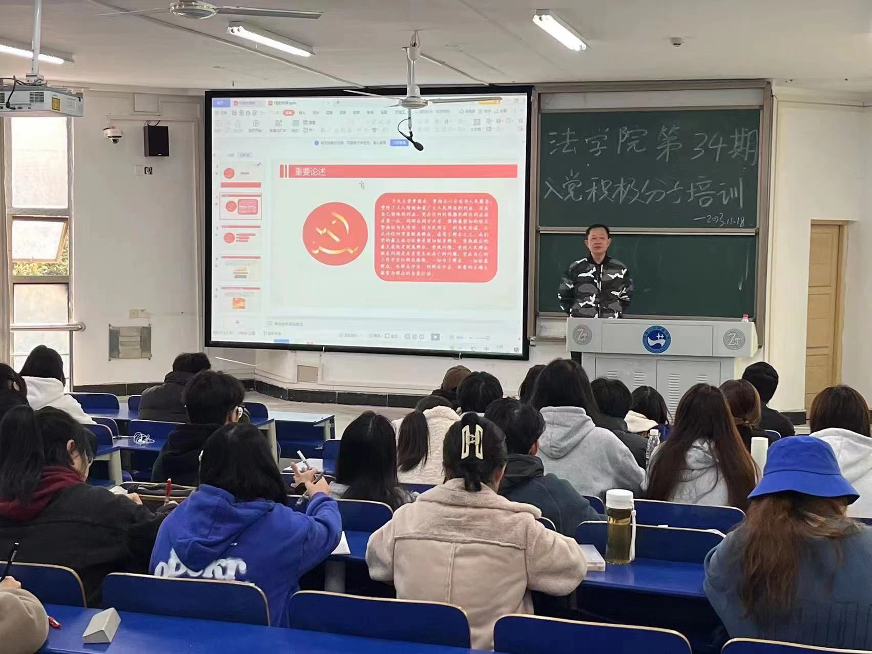 2023年11月18日,法学院分党校第34期入党积极分子培训班在致远楼201教室举行。此次线下培训为期两天,共58个学员参加。课前,辅导员廖俊宏强调本次培训的重要性,并对培训班的纪律要求和考勤考核做出重点说明。