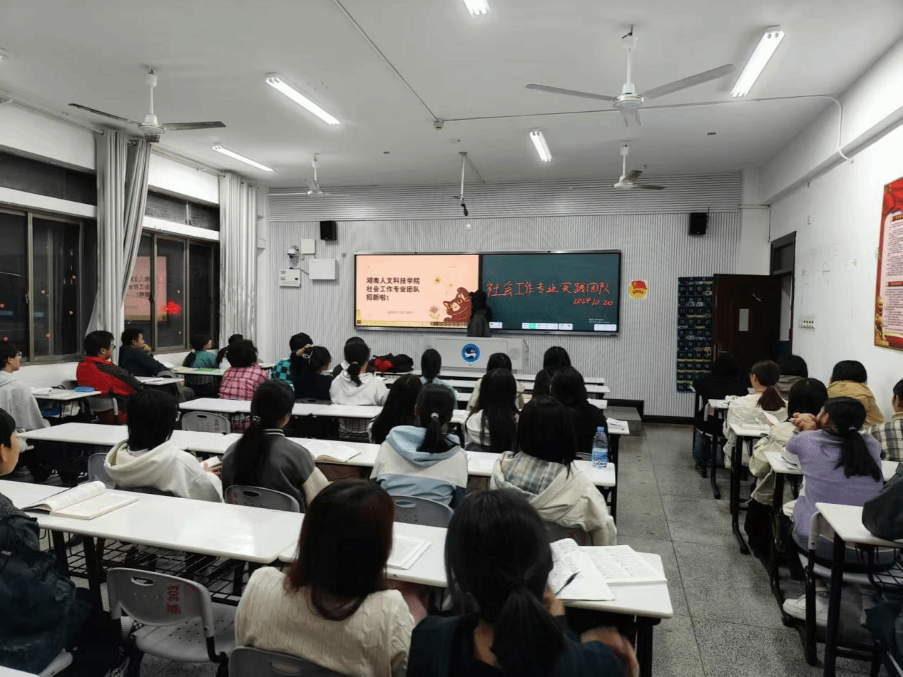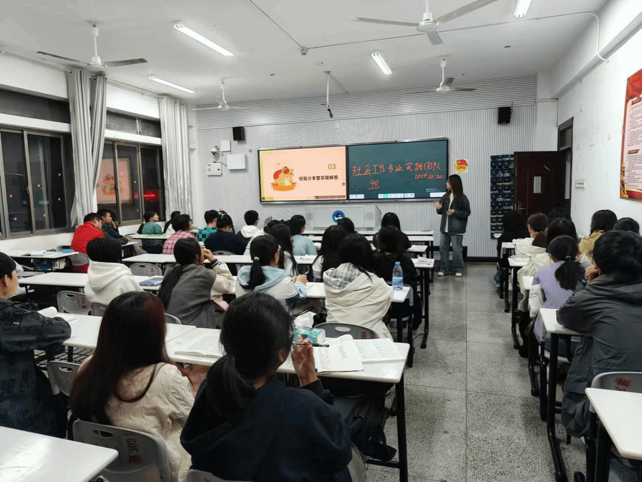 10月20日,社会工作实践队于致远楼202教室举行“芙蓉学子·榜样力量”的首场宣讲。本次宣讲由团队成员李湘主讲,法学院23级社会工作专业学生参与活动。