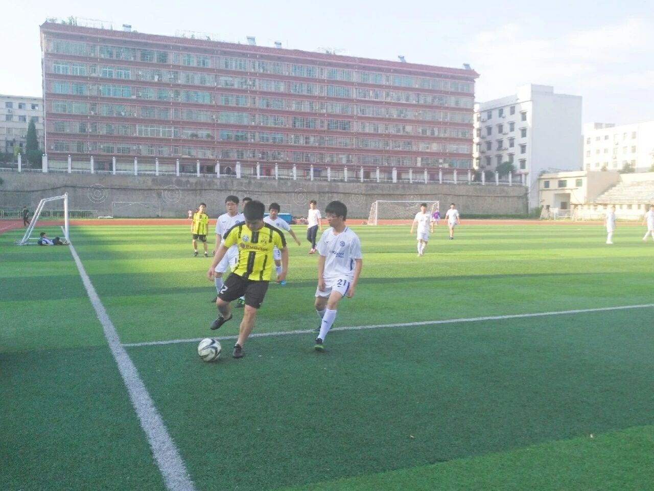 烈日炎炎下,身着黄色球衣的法学院健儿们不受躁热天气的影响,很快便进入了比赛状态,在球场上来了一次次漂亮的穿插与精妙的助攻。在上半场比赛中,我队守门人严防自家球门,关键时刻传球员凭借一脚远射,率先攻破对方防守,获得领先。在下半场比赛中,材环院球员紧追比分,同样通过远射球获分,比赛最终以两队1:1持平收尾。